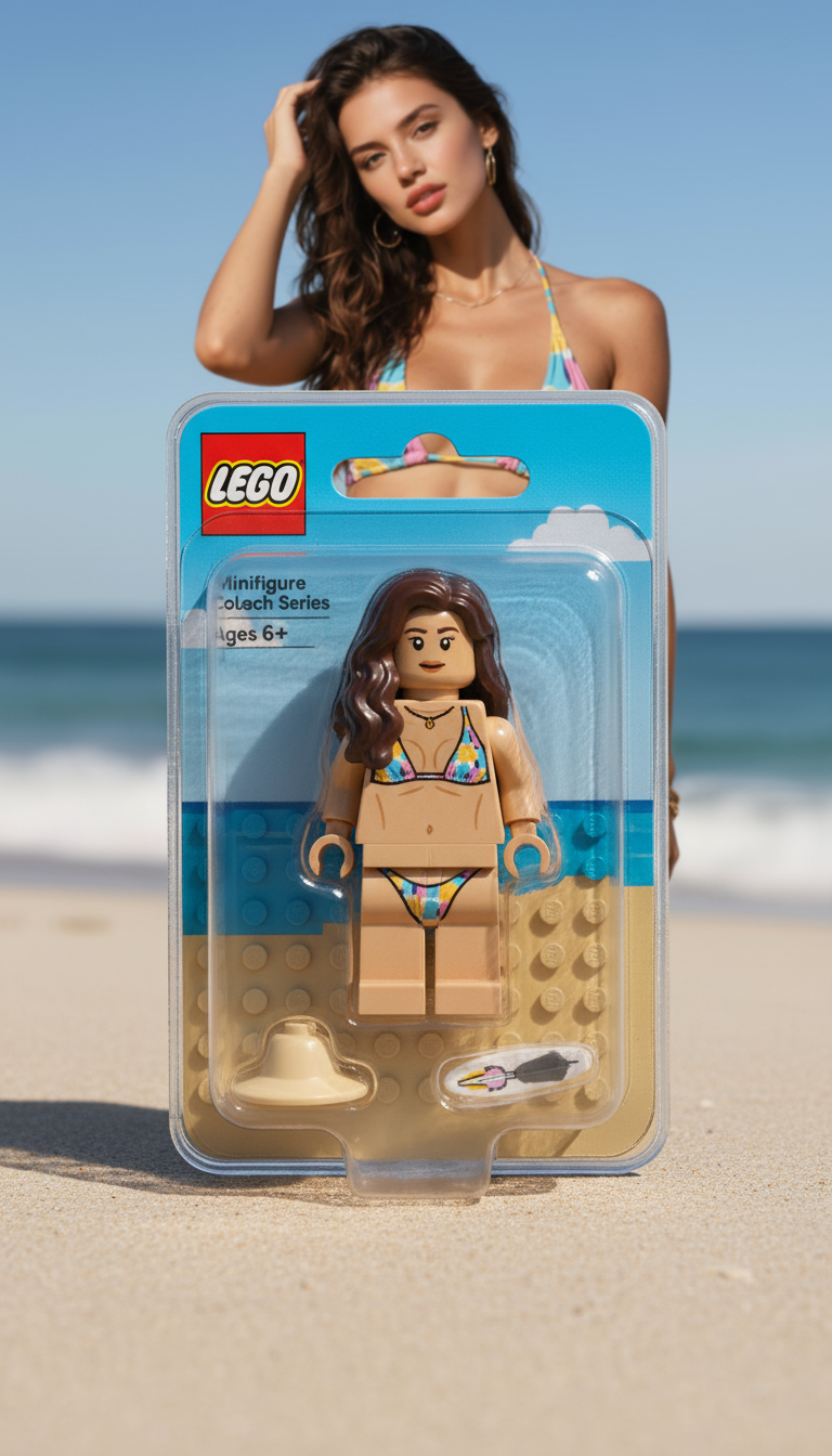 "Transform the person into a LEGO minifigure, inside its packaging box."
