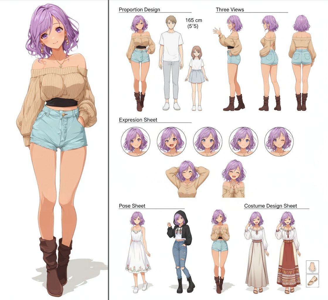 Generate comprehensive character sheets with turnarounds, expressions, and details for animation and games.