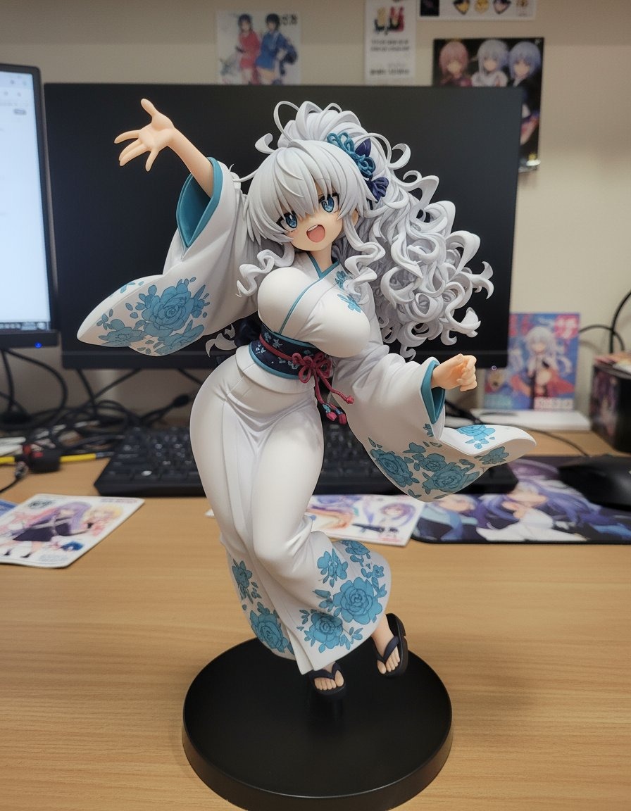 Create a 1/7 scale commercialized figurine of the character in the picture, in a realistic style, in a real environment. The figurine is placed on a computer desk. The figurine has a round transparent acrylic base. The content on the computer screen is a 3D modeling process of this figurine. Next to the computer screen is a toy packaging box, designed in a style reminiscent of high-quality collectible figures, printed with original artwork. The packaging features two-dimensional flat illustrations of the figurine.