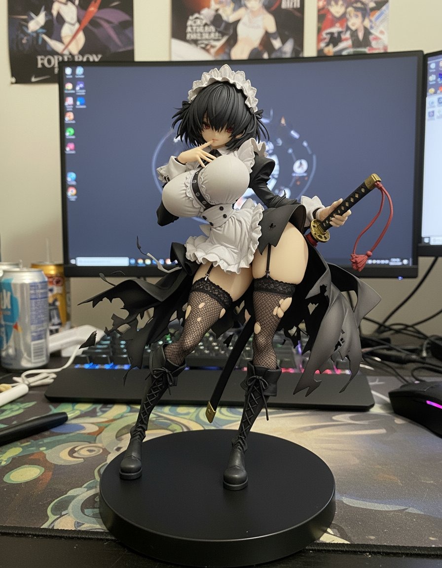 create a 1/7 scale commercialized figurine of the characters in the picture, in a realistic style, in a real environment. The figurine is placed on a computer desk. The figurine has a round transparent acrylic base, with no text on the base. The content on the computer screen is the brush modeling process of this figurine. Next to the computer screen is a BANDAl-style toy packaging box printed with the original artwork., The packaging features two-dimensional flat illustrations. Please turn this photo into afigure. Behind it, there should be a Model packaging box with the character from this photo printed on it. In front of thebox.on a round plastic baseplace the fiqure version of thephoto I gave you. I'd like the PVC material to be clearlyrepresented. It would be even better if the background is indoors.