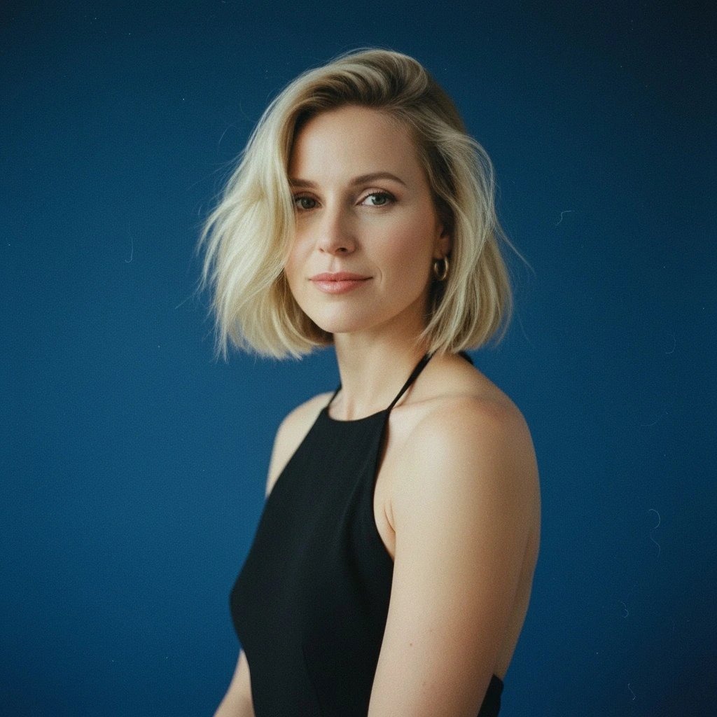 "Soft window light headshot, 85mm lens, f/1.8, light gray backdrop, subtle freckles, natural skin retouch, bright catchlights."