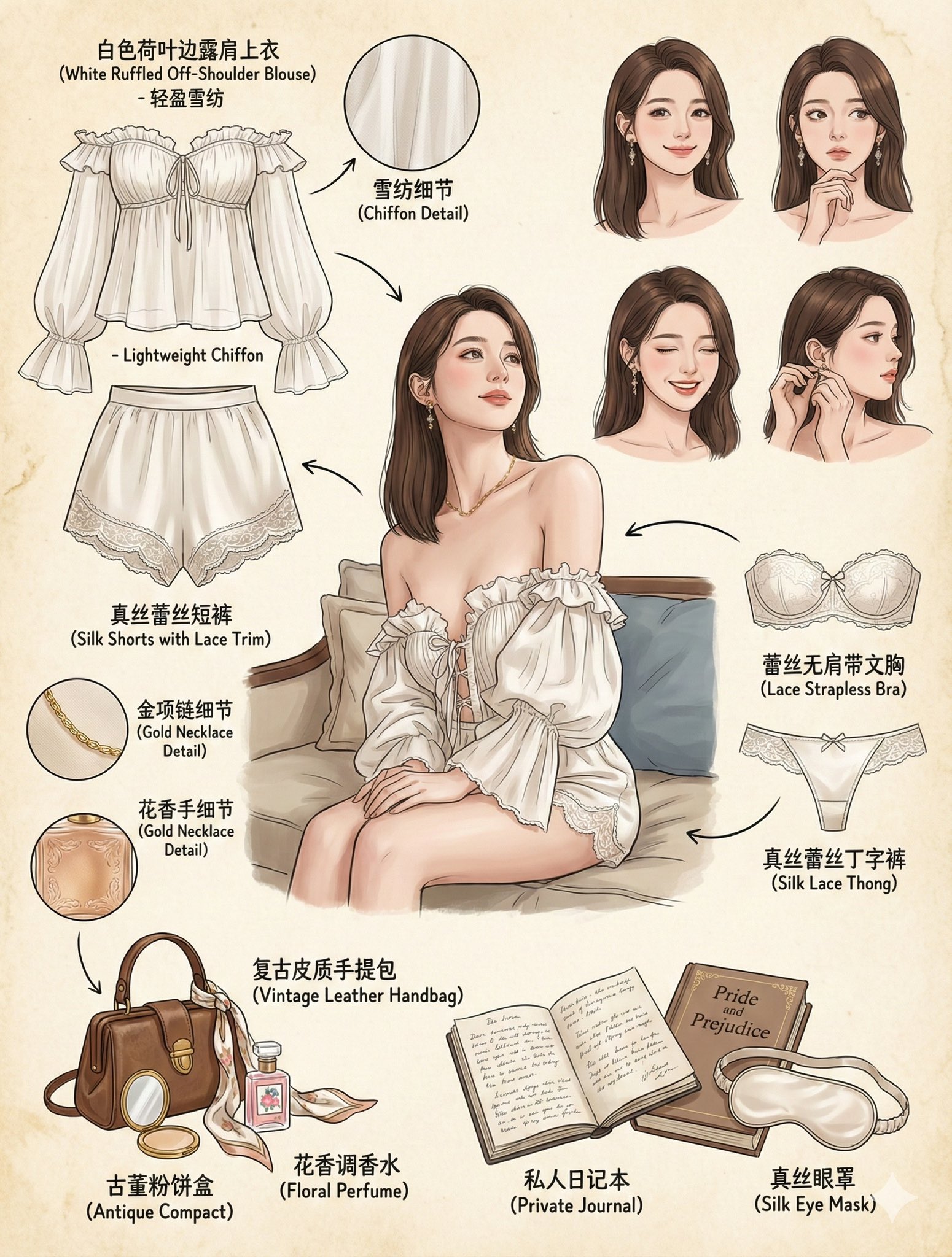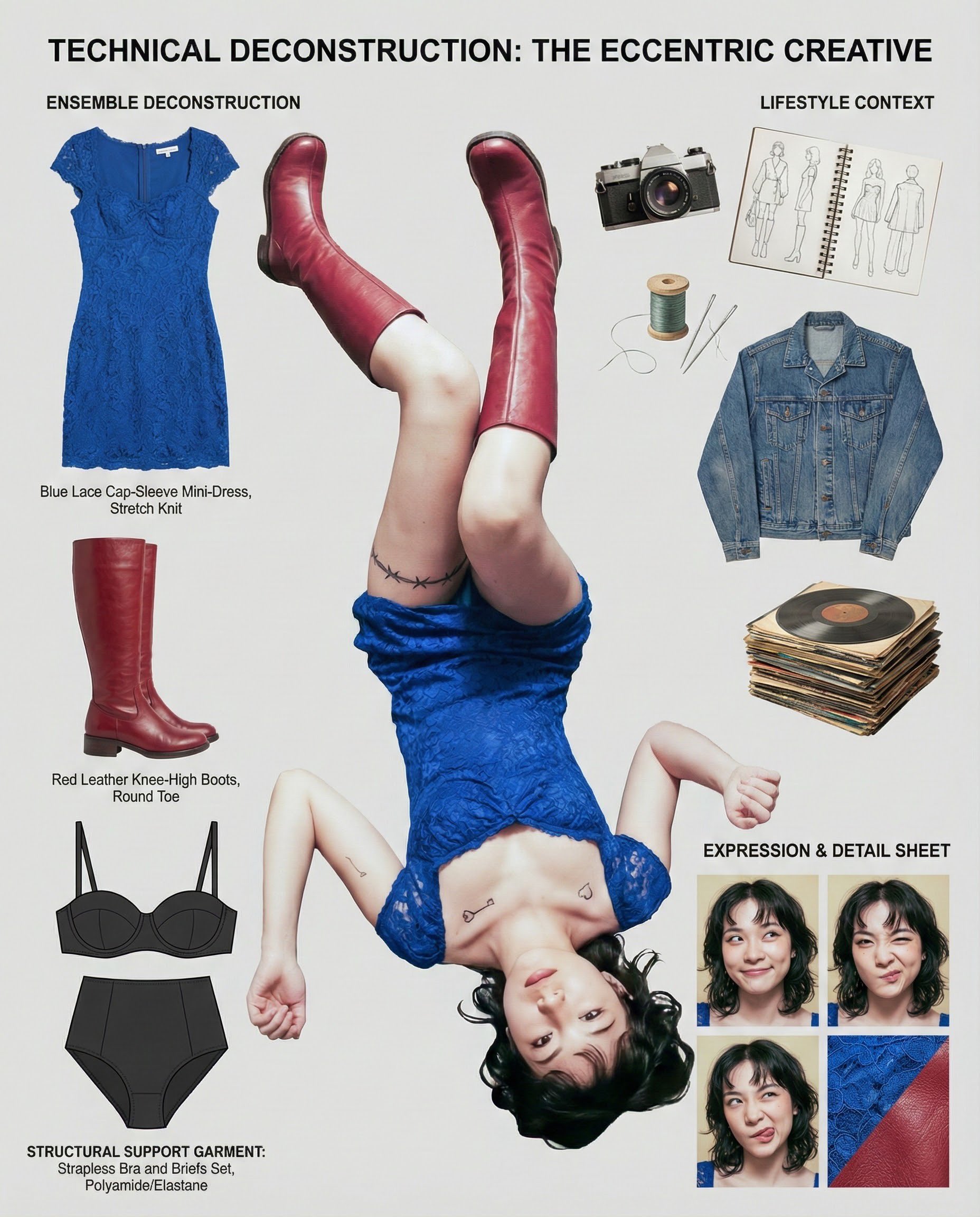 Create a comprehensive Wardrobe Deconstruction and Style Profile collage based on an uploaded image. Deconstruct ensembles, showcase materials, and reveal character details.