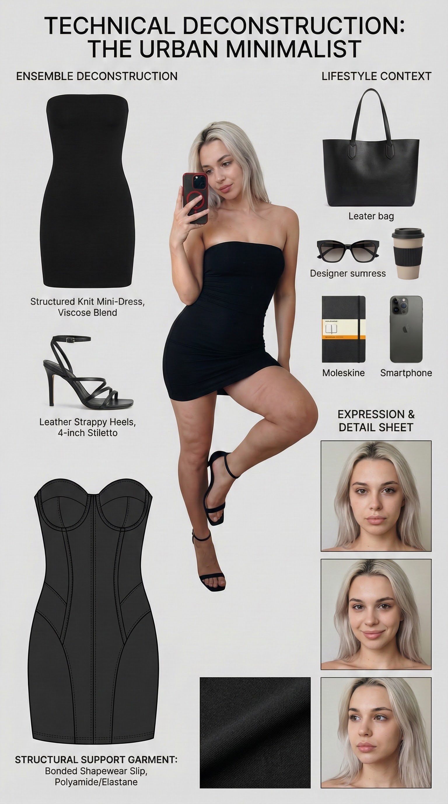 Technical Deconstruction: The Urban Minimalist. A clean layout showing a monochrome outfit breakdown, leather backpack contents, and a coffee tumbler.