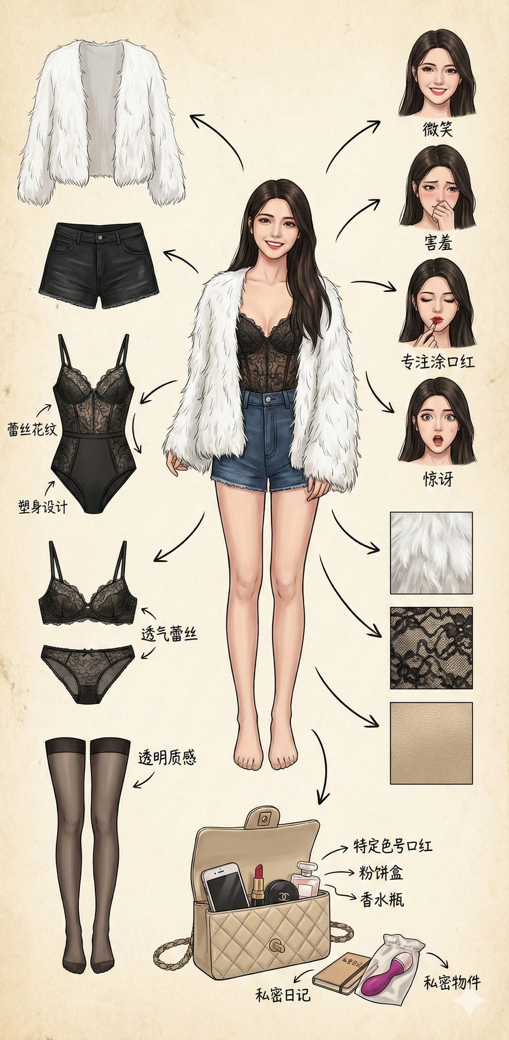 Include 'lifestyle items' or 'bag contents' that hint at the character's daily routine and personality.